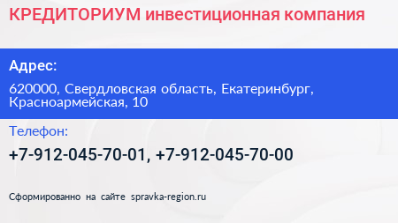 КРЕДИТОРИУМ, инвестиционная компания по адресу 620000, Свердловская область, Екатеринбург, Красноармейская, 10 в дальнейшем Организация, размещена в следующих категориях: