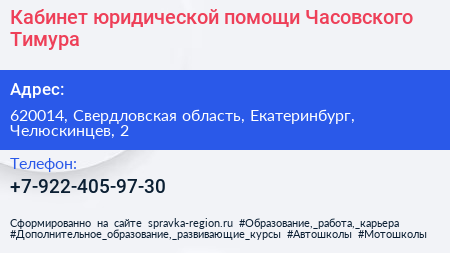 Кабинет юридической помощи Часовского Тимура по адресу 620014, Свердловская область, Екатеринбург, Челюскинцев, 2 в дальнейшем Организация, размещена в следующих категориях: