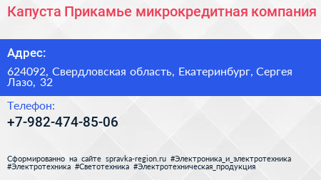 Капуста Прикамье, микрокредитная компания по адресу 624092, Свердловская область, Екатеринбург, Сергея Лазо, 32 в дальнейшем Организация, размещена в следующих категориях: