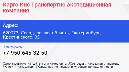 Карго-Инс, Транспортно-экспедиционная компания по адресу 620073, Свердловская область, Екатеринбург, Крестинского, 35 в дальнейшем Организация, размещена в следующих категориях: