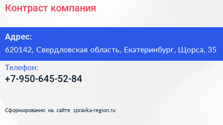 Контраст, компания по адресу 620142, Свердловская область, Екатеринбург, Щорса, 35 в дальнейшем Организация, размещена в следующих категориях: