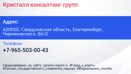 Кристалл консалтинг групп по адресу 620010, Свердловская область, Екатеринбург, Черняховского, 86/2 в дальнейшем Организация, размещена в следующих категориях: