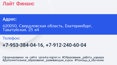Лайт Финанс по адресу 620050, Свердловская область, Екатеринбург, Таватуйская, 25 к4 в дальнейшем Организация, размещена в следующих категориях: