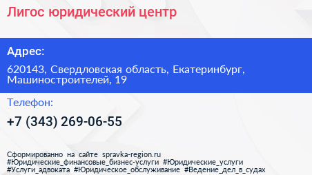 Лигос, юридический центр по адресу 620143, Свердловская область, Екатеринбург, Машиностроителей, 19 в дальнейшем Организация, размещена в следующих категориях: