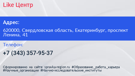Like Центр по адресу 620000, Свердловская область, Екатеринбург, проспект Ленина, 41 в дальнейшем Организация, размещена в следующих категориях: