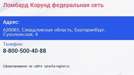 Ломбард Корунд, федеральная сеть по адресу 620085, Свердловская область, Екатеринбург, Сухоложская, 4 в дальнейшем Организация, размещена в следующих категориях:
