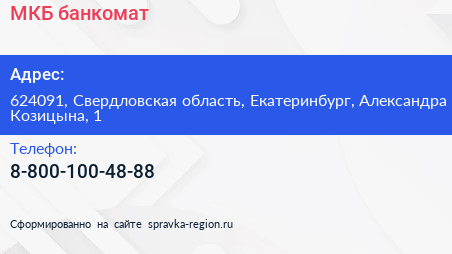 МКБ, банкомат по адресу 624091, Свердловская область, Екатеринбург, Александра Козицына, 1 в дальнейшем Организация, размещена в следующих категориях: