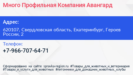 Много Профильная Компания Авангард по адресу 620107, Свердловская область, Екатеринбург, Героев России, 2 в дальнейшем Организация, размещена в следующих категориях: