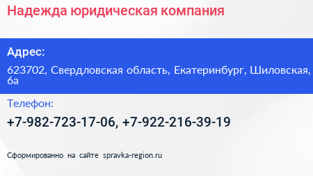 Надежда, юридическая компания по адресу 623702, Свердловская область, Екатеринбург, Шиловская, 6а в дальнейшем Организация, размещена в следующих категориях: