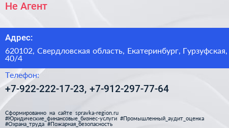 Не Агент по адресу 620102, Свердловская область, Екатеринбург, Гурзуфская, 40/4 в дальнейшем Организация, размещена в следующих категориях: