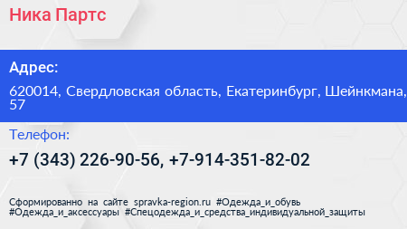 Ника-Партс по адресу 620014, Свердловская область, Екатеринбург, Шейнкмана, 57 в дальнейшем Организация, размещена в следующих категориях: