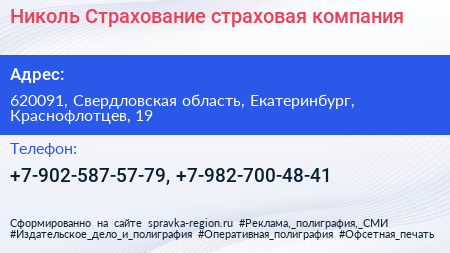 Николь-Страхование, страховая компания по адресу 620091, Свердловская область, Екатеринбург, Краснофлотцев, 19 в дальнейшем Организация, размещена в следующих категориях: