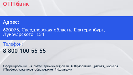 ОТП банк по адресу 620075, Свердловская область, Екатеринбург, Луначарского, 134 в дальнейшем Организация, размещена в следующих категориях: