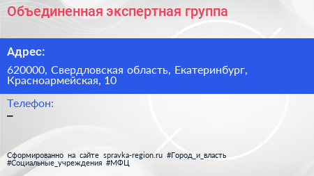 Объединенная экспертная группа по адресу 620000, Свердловская область, Екатеринбург, Красноармейская, 10 в дальнейшем Организация, размещена в следующих категориях:
