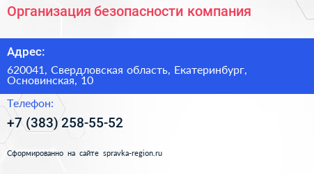 Организация безопасности, компания по адресу 620041, Свердловская область, Екатеринбург, Основинская, 10 в дальнейшем Организация, размещена в следующих категориях: