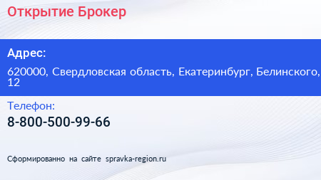 Открытие Брокер по адресу 620000, Свердловская область, Екатеринбург, Белинского, 12 в дальнейшем Организация, размещена в следующих категориях: