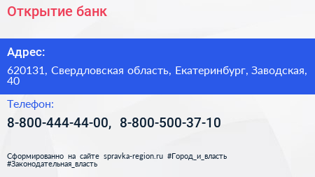 Открытие, банк по адресу 620131, Свердловская область, Екатеринбург, Заводская, 40 в дальнейшем Организация, размещена в следующих категориях: