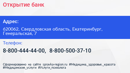 Открытие, банк по адресу 620062, Свердловская область, Екатеринбург, Генеральская, 7 в дальнейшем Организация, размещена в следующих категориях: