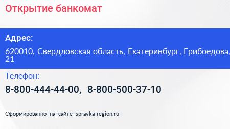 Открытие, банкомат по адресу 620010, Свердловская область, Екатеринбург, Грибоедова, 21 в дальнейшем Организация, размещена в следующих категориях: