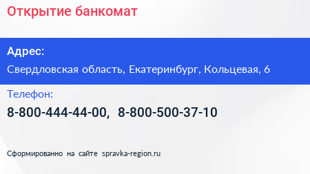 Открытие, банкомат по адресу Свердловская область, Екатеринбург, Кольцевая, 6 в дальнейшем Организация, размещена в следующих категориях: