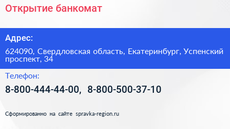 Открытие, банкомат по адресу 624090, Свердловская область, Екатеринбург, Успенский проспект, 34 в дальнейшем Организация, размещена в следующих категориях: