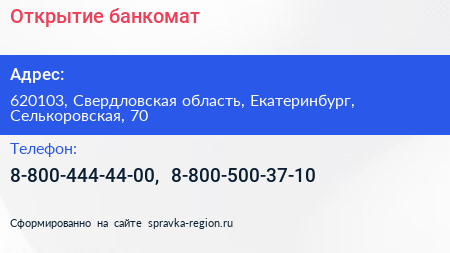 Открытие, банкомат по адресу 620103, Свердловская область, Екатеринбург, Селькоровская, 70 в дальнейшем Организация, размещена в следующих категориях: