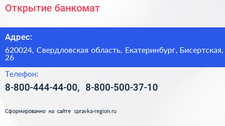 Открытие, банкомат по адресу 620024, Свердловская область, Екатеринбург, Бисертская, 26 в дальнейшем Организация, размещена в следующих категориях: