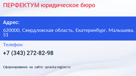 ПЕРФЕКТУМ, юридическое бюро по адресу 620000, Свердловская область, Екатеринбург, Малышева, 51 в дальнейшем Организация, размещена в следующих категориях:
