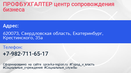 ПРОФБУХГАЛТЕР, центр сопровождения бизнеса по адресу 620073, Свердловская область, Екатеринбург, Крестинского, 35а в дальнейшем Организация, размещена в следующих категориях: