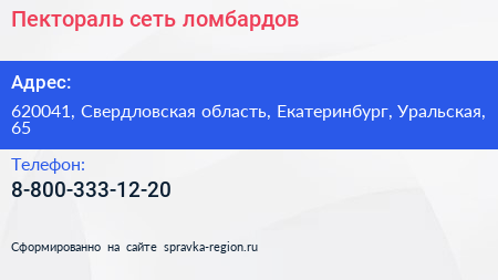 Пектораль, сеть ломбардов по адресу 620041, Свердловская область, Екатеринбург, Уральская, 65 в дальнейшем Организация, размещена в следующих категориях: