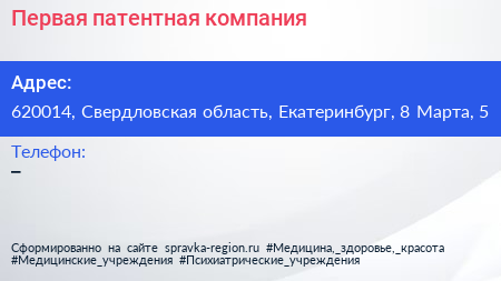 Первая патентная компания по адресу 620014, Свердловская область, Екатеринбург, 8 Марта, 5 в дальнейшем Организация, размещена в следующих категориях: