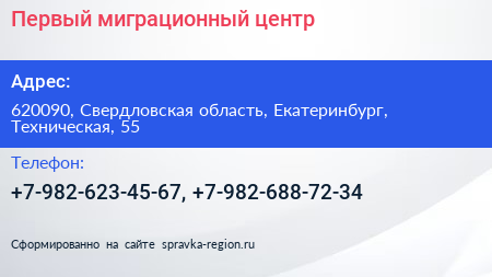 Первый миграционный центр по адресу 620090, Свердловская область, Екатеринбург, Техническая, 55 в дальнейшем Организация, размещена в следующих категориях: