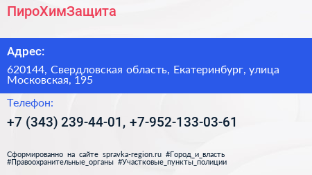 ПироХимЗащита по адресу 620144, Свердловская область, Екатеринбург, улица Московская, 195 в дальнейшем Организация, размещена в следующих категориях:
