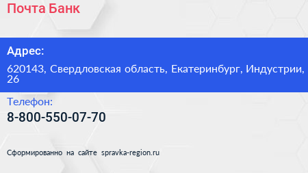 Почта Банк по адресу 620143, Свердловская область, Екатеринбург, Индустрии, 26 в дальнейшем Организация, размещена в следующих категориях: