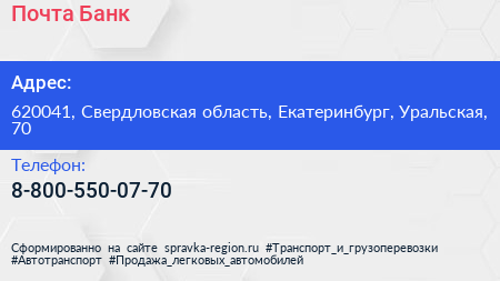 Почта Банк по адресу 620041, Свердловская область, Екатеринбург, Уральская, 70 в дальнейшем Организация, размещена в следующих категориях: