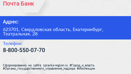 Почта Банк по адресу 623701, Свердловская область, Екатеринбург, Театральная, 28 в дальнейшем Организация, размещена в следующих категориях:
