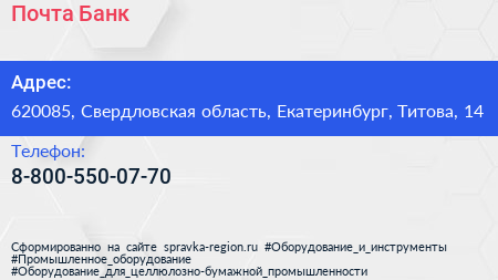 Почта Банк по адресу 620085, Свердловская область, Екатеринбург, Титова, 14 в дальнейшем Организация, размещена в следующих категориях:
