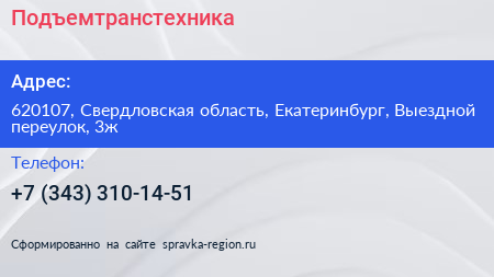 Подъемтранстехника по адресу 620107, Свердловская область, Екатеринбург, Выездной переулок, 3ж в дальнейшем Организация, размещена в следующих категориях: