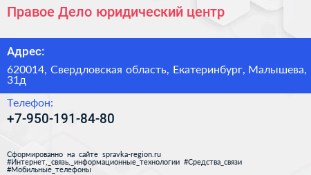 Правое Дело, юридический центр по адресу 620014, Свердловская область, Екатеринбург, Малышева, 31д в дальнейшем Организация, размещена в следующих категориях: