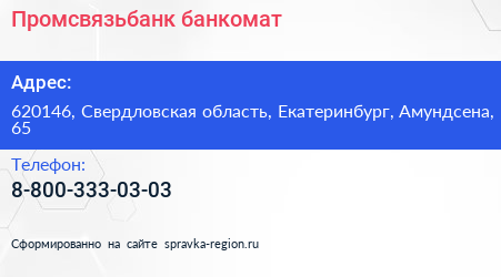 Промсвязьбанк, банкомат по адресу 620146, Свердловская область, Екатеринбург, Амундсена, 65 в дальнейшем Организация, размещена в следующих категориях: