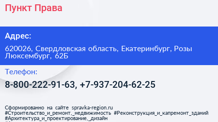 Пункт Права по адресу 620026, Свердловская область, Екатеринбург, Розы Люксембург, 62Б в дальнейшем Организация, размещена в следующих категориях: