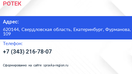 РОТЕК по адресу 620144, Свердловская область, Екатеринбург, Фурманова, 109 в дальнейшем Организация, размещена в следующих категориях: