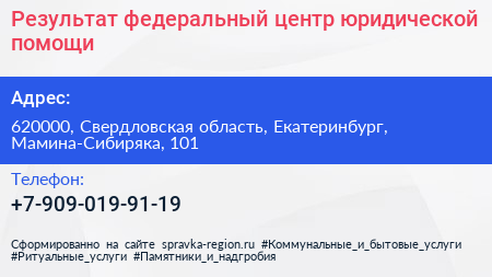 Результат, федеральный центр юридической помощи по адресу 620000, Свердловская область, Екатеринбург, Мамина-Сибиряка, 101 в дальнейшем Организация, размещена в следующих категориях: