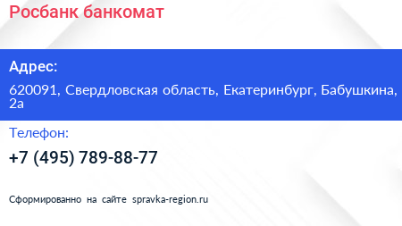 Росбанк, банкомат по адресу 620091, Свердловская область, Екатеринбург, Бабушкина, 2а в дальнейшем Организация, размещена в следующих категориях: