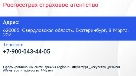 Росгосстрах, страховое агентство по адресу 620085, Свердловская область, Екатеринбург, 8 Марта, 207 в дальнейшем Организация, размещена в следующих категориях: