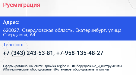 Русмиграция по адресу 620027, Свердловская область, Екатеринбург, улица Свердлова, 64 в дальнейшем Организация, размещена в следующих категориях:
