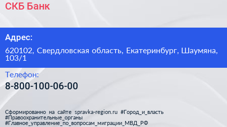 СКБ-Банк по адресу 620102, Свердловская область, Екатеринбург, Шаумяна, 103/1 в дальнейшем Организация, размещена в следующих категориях: