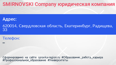 SMIRNOVSKI Company, юридическая компания по адресу 620014, Свердловская область, Екатеринбург, Радищева, 33 в дальнейшем Организация, размещена в следующих категориях: