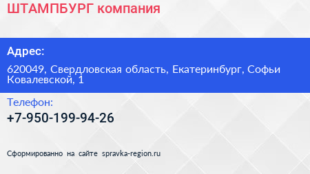 ШТАМПБУРГ, компания по адресу 620049, Свердловская область, Екатеринбург, Софьи Ковалевской, 1 в дальнейшем Организация, размещена в следующих категориях: