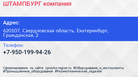 ШТАМПБУРГ, компания по адресу 620107, Свердловская область, Екатеринбург, Гражданская, 2 в дальнейшем Организация, размещена в следующих категориях: